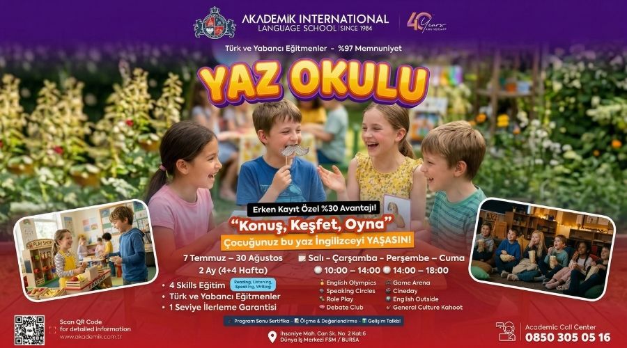 Bursa’da çocuklar için İngilizce yaz okulu arayan aileler için hazırlanan Akademik International Yaz Okulu 2026, Nilüfer, FSM, Ataevler ve Özlüce bölgelerinde yaşayan öğrenciler için eğitici, güvenli ve eğlenceli bir yaz programı sunar. Çocukların yaz tatilini hem verimli hem de keyifli geçirmesini amaçlayan bu program, İngilizceyi yalnızca ders olarak değil, günlük yaşamın doğal bir parçası olarak deneyimleme fırsatı sağlar.